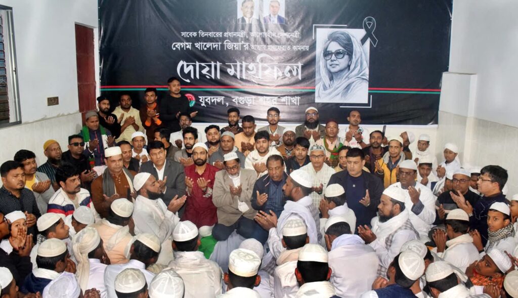 বুধবার শহরের কবি নজরুল ইসলাম রোডস্থ শহর যুবদল কার্যালয়ে বাদ জোহর দোয়া মাহ্ফিল পূর্বে আহসান হাবিব মমির সভাপতিত্বে ও সাধারণ সম্পাদক আদিল শাহরিয়ার গোর্কি’র সঞ্চালনায় বেগম খালেদা জিয়ার কর্মজীবনের উপর আলোচনা করেন জেলা বিএনপির সভাপতি রেজাউল করিম বাদশা। তিনি বলেন, ইসলাম ও আলেম-সমাজের জন্য দরদী ছিলেন বেগম খালেদা জিয়া। বাংলাদেশের রাজনীতিতে ধর্মীয় মূল্যবোধের প্রতিফলন এবং আলেম-সমাজের সঙ্গে সুদৃঢ় সম্পর্কের এক অনন্য উদাহরণ তৈরি করেছিলেন বিএনপি চেয়ারপারসন বেগম খালেদা জিয়া। তিনি ব্যক্তিগত জীবনে যেমন ধর্মপ্রাণ ছিলেন, আলেম সমাজের প্রতি দরদ করতেন- তেমনি রাষ্ট্রীয়ভাবে ইসলামের প্রসারেও তিনি কার্যকর ভূমিকা রেখেছেন। দোয়া মাহফিলে উপস্থিত ছিলেন শহর বিএনপির সভাপতি এ্যাডঃ হামিদুল হক চৌধুরী হিরু, জেলা বিএনপির সাংগঠনিক সম্পাদক সহিদ উন নবী সালাম, জেলা যুবদলের সাবেক আহ্বায়ক খাদেমুল ইসলাম খাদেম, জেলা যুবদলের সভাপতি জাহাঙ্গীর আলম, শহর যুবদলের সিনিঃ সহ-সভাপতি তারিক মজিদ সোহাগ, সাংগঠনিক সম্পাদক সৌরভ হাসান শিপলু, সিনিঃ সাধারণ সম্পাদক আবু সাইদ মন্ডল সহ শহর ও ওয়ার্ড যুবদলের বিভিন্ন পর্যায়ের নেতাকর্মীবৃন্দ।গাবতলী উপজেলার তেতুলগাছি জামিয়া রহমানিয়া মাদ্রাসার ৪০জন শির্ক্ষাথীর অংশগ্রহনে কোরআন খতম ও দোয়া পরিচালনা করেন হাফেজমাওলানা মোঃ আব্দুর রহিম।