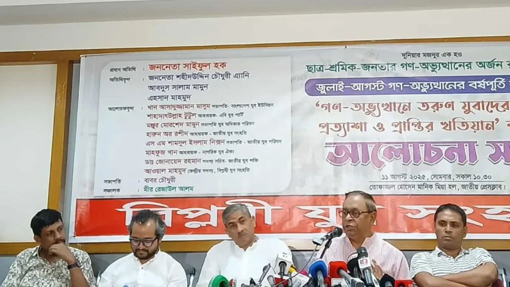 সোমবার (১১ আগস্ট) দুপুরে জাতীয় প্রেস ক্লাবে বিপ্লবী যুব সংহতির উদ্যোগে ‘গণঅভ্যুত্থানে তরুণ-যুবাদের স্বপ্ন : প্রত্যাশা আর প্রাপ্তির খতিয়ান’ শীর্ষক আলোচনা সভায় প্রধান অতিথির বক্তব্যে সাইফুল হক এসব কথা বলেন।