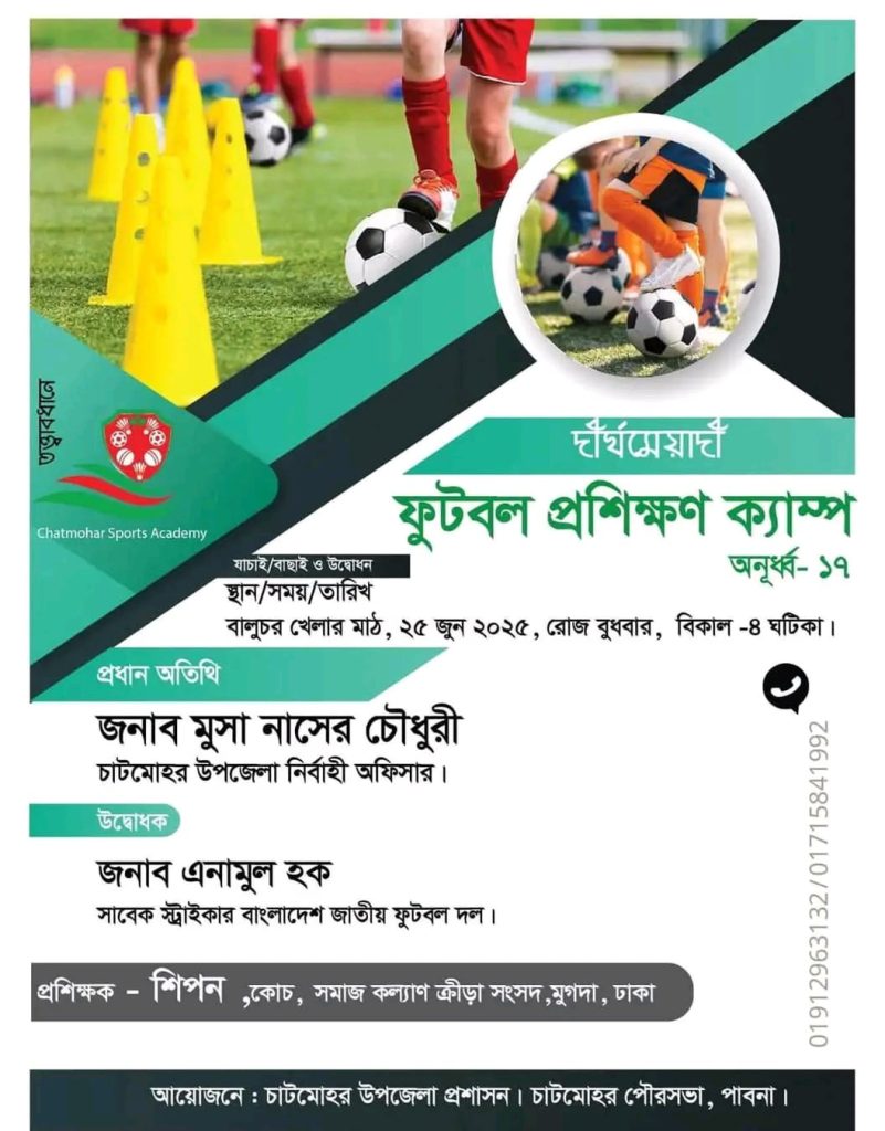 চাটমোহরে ক্রীড়ামতিদের জন্য দারুণ সুখবর বিনামূল্যে প্রশিক্ষণ ক্যাম্প।আসুন আমরা তরুণ সমাজকে ক্রীড়া ও সাংস্কৃতিক কর্মকাণ্ডের সাথে যুক্ত করি, মাদক ও কিশোরগ্যাংমুক্ত সমাজ গড়ি। চাটমোহর উপজেলার তরুণদের খেলার মান উন্নয়ন ও খেলাধুলার প্রতি আরও আগ্রহ বৃদ্ধির লক্ষ্যে চাটমোহর উপজেলা প্রশাসন ও চাটমোহর পৌরসভার উদ্যোগে দীর্ঘমেয়াদী ফুটবল প্রশিক্ষণ ক্যাম্পের আয়োজন করা হয়েছে। দেশের স্বনামধন্য ও বিখ্যাত কোচ এই ক্যাম্প পরিচালনা করবেন। চাটমোহরের প্রাক্তন কৃতি খেলোয়াড়গণ সার্বিক সহযোগিতা করবেন। আগ্রহী খেলোয়াড়গণ (অনূর্ধ্ব ১৭) বাছাই পর্বে উত্তীর্ণ হলে বিনামূল্যে উক্ত প্রশিক্ষণ ক্যাম্পে অংশগ্রহণ করতে পারবে। বাছাই পর্ব ও ক্যাম্পের উদ্বোধনী অনুষ্ঠানসূচি তারিখ: ২৫ জুন ২০২৫, বুধবার সময়: বিকাল ৪.০০ টা স্থান: চাটমোহর বালুচর মাঠ
