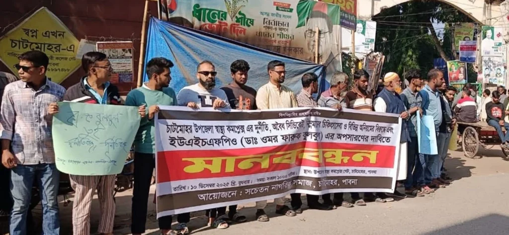 পাবনার চাটমোহর উপজেলা স্বাস্থ্য কমপ্লেক্সে কর্মরত গরিব-অসহায় মানুষের আশার নাম হিসেবে পরিচিত চিকিৎসক ডা. আলমগীর হোসেনের বদলি প্রত্যাহার এবং উপজেলা স্বাস্থ্য ও পরিবার পরিকল্পনা কর্মকর্তা (টিএইচও) ডা. ওমর ফারুক বুলবুলের অপসারণ দাবিতে মানববন্ধন অনুষ্ঠিত হয়েছে।
