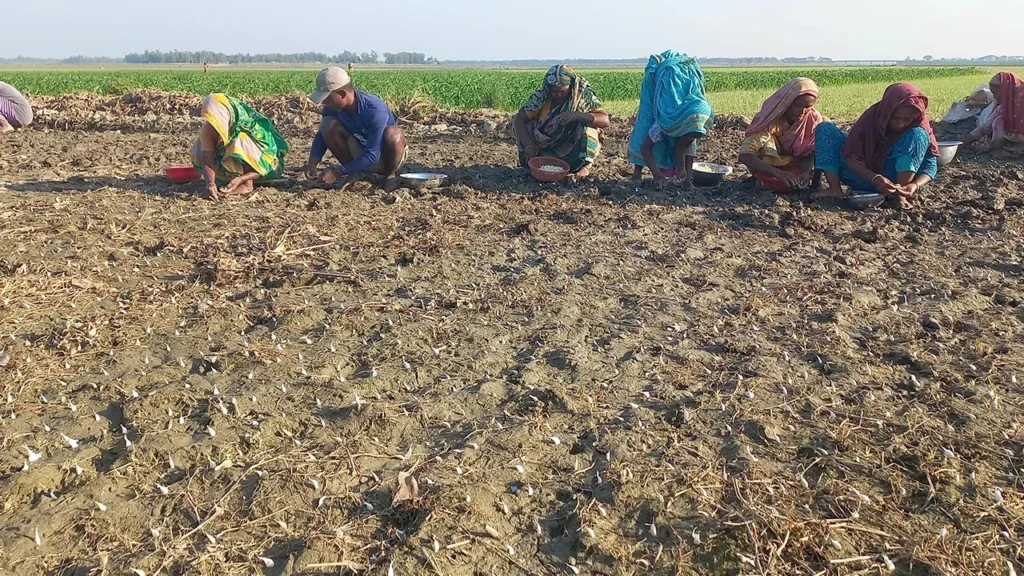 রসুন রোপনের সবচেয়ে গুরুত্বপূর্ণ অংশটি নারীদের শ্রমনির্ভর। বীজ বাছাই থেকে রোপন পর্যন্ত বেশির ভাগ কাজই করেন নারী শ্রমিকরা। একজন নারী শ্রমিকের দৈনিক মজুরি ৪০০ টাকা, যেখানে পুরুষ শ্রমিক পান ৬০০ টাকার কম নয়। ফলে রসুন চাষে নারী শ্রমিকের ওপরই বেশি নির্ভরশীল কৃষকরা।