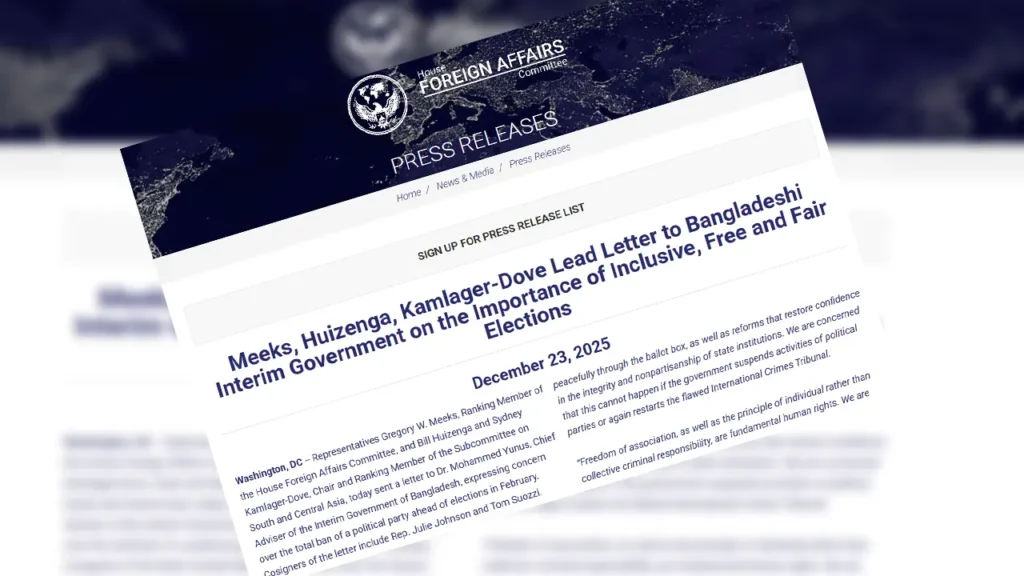 বাংলাদেশে অবাধ, সুষ্ঠু ও অন্তর্ভুক্তিমূলক নির্বাচন নিশ্চিত করার আহ্বান জানিয়ে অন্তর্বর্তী সরকারের প্রধান উপদেষ্টা ড. মুহাম্মদ ইউনূসের কাছে একটি আনুষ্ঠানিক চিঠি পাঠিয়েছেন মার্কিন পার্লামেন্টের নিম্নকক্ষ প্রতিনিধি পরিষদের পাঁচ প্রভাবশালী সদস্য (কংগ্রেসম্যান)।