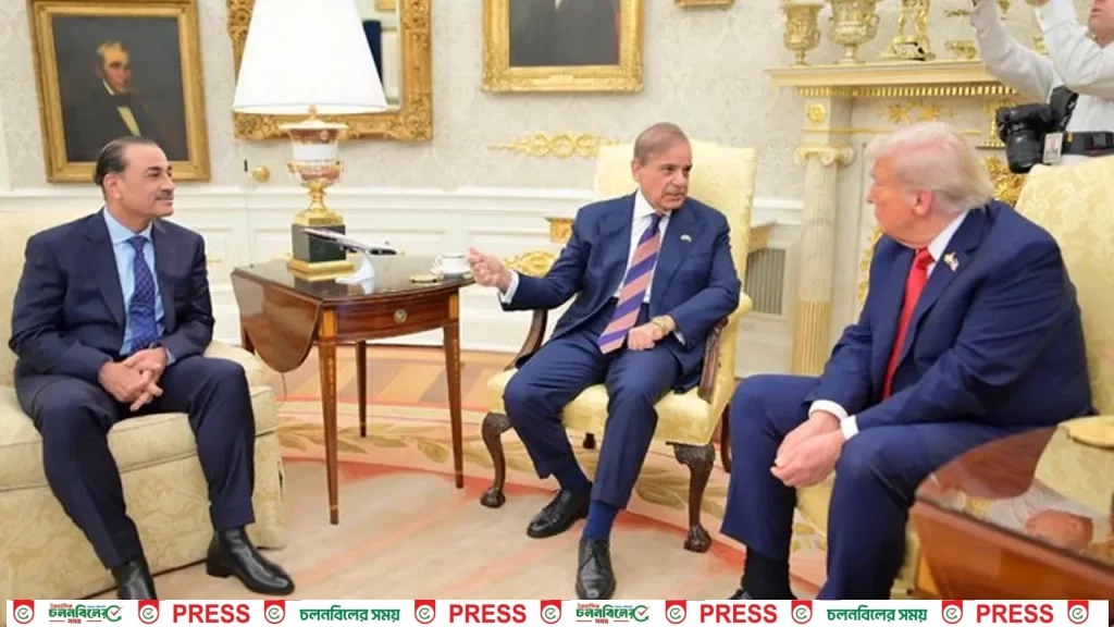 যুক্তরাষ্ট্রের প্রেসিডেন্ট ডোনাল্ড ট্রাম্পের সঙ্গে হোয়াইট হাউসে বৈঠক করেছেন পাকিস্তানের প্রধানমন্ত্রী শাহবাজ শরিফ ও সেনাবাহিনীর প্রধান ফিল্ড মার্শাল সৈয়দ আসিম মুনির। সেনাপ্রধানের উপস্থিতিতে প্রধানমন্ত্রীর এ বৈঠককে ‘বিরল’ বলছে পাকিস্তানি সংবাদমাধ্যম। বলা হচ্ছে, ট্রাম্পের সঙ্গে পাকিস্তানি শীর্ষ নেতৃত্ব দ্বিপক্ষীয় ও আঞ্চলিক নানা গুরুত্বপূর্ণ ইস্যু নিয়ে আলোচনা করেছেন। আলোচনায় ছিল ভারত প্রসঙ্গও।