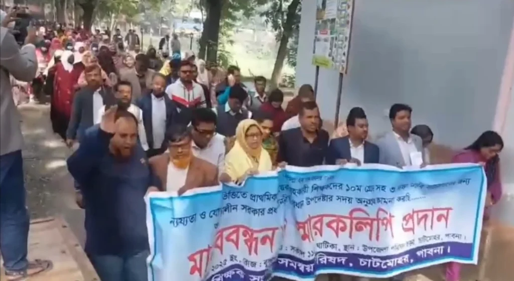 পাবনার চাটমোহরে প্রাথমিক বিদ্যালয়ের সহকারী শিক্ষকেরা ১০ম গ্রেডসহ তিন দফা দাবির বাস্তবায়নের জন্য মানববন্ধন কর্মসূচি পালন করেছেন।