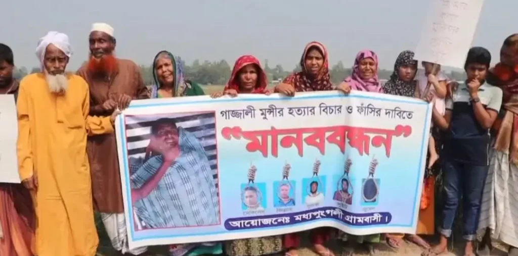মানববন্ধনে বক্তব্য দেন নিহতের মেঝ ভাই ইউনুস আলী, আত্মীয় হারিম মুন্সী, নিহতের স্ত্রী শিউলি বেগম, মা বেলি খাতুনসহ অনেকে।