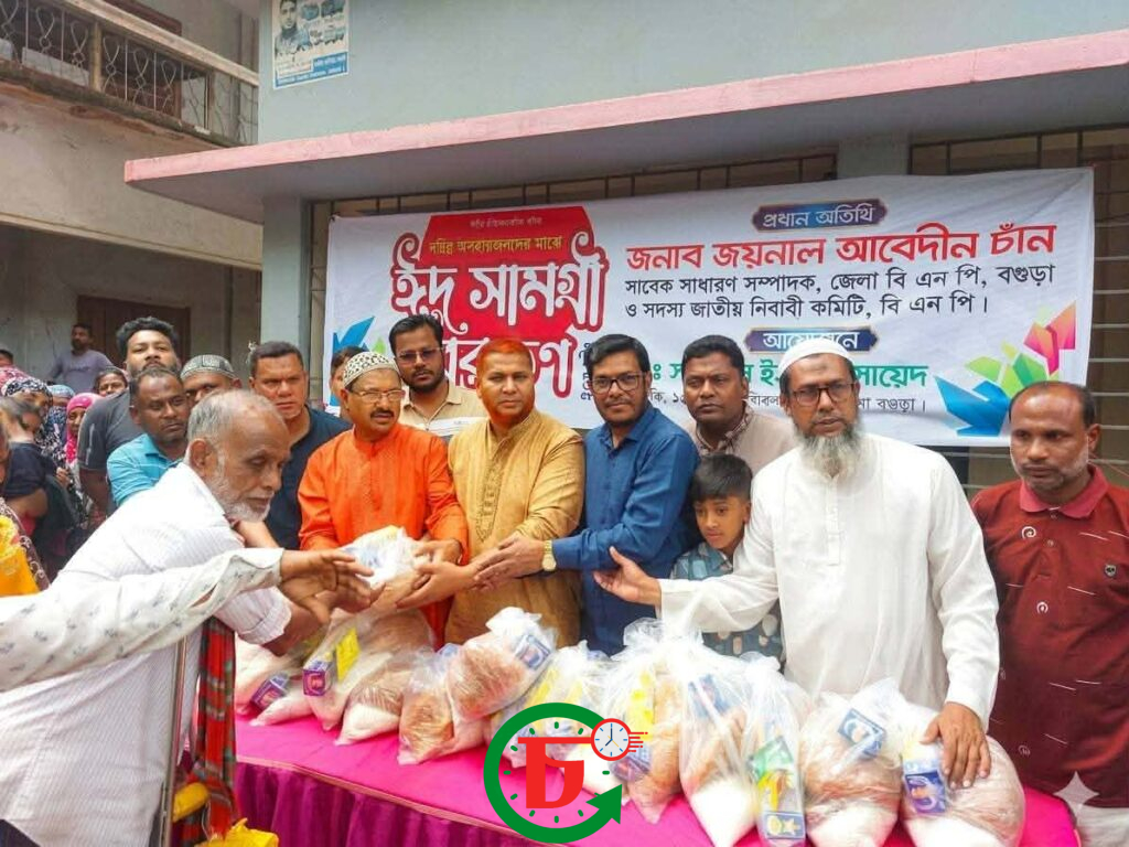 ১৮ মার্চ বুধবার বগুড়া শহরের ১৩ নং ওয়ার্ডের কৈগাড়ি ফুলতলা এলাকায় অসহায় ও দুস্থ মানুষদের মাঝে ঈদ সামগ্রী বিতরণ করা হয়েছে। পবিত্র ঈদুল ফিতর উপলক্ষে বিএনপির ভারপ্রাপ্ত চেয়ারম্যান তারেক রহমানের নির্দেশে এবং ১৩ নং ওয়ার্ড বিএনপির সভাপতি সাঈদুর রহমান সাঈদের ব্যক্তিগত উদ্যোগে এই উপহার সামগ্রী বিতরণ অনুষ্ঠানের আয়োজন করা হয়। অনুষ্ঠানে প্রধান অতিথি হিসেবে উপস্থিত ছিলেন বিএনপি জাতীয় নির্বাহী কমিটির সদস্য ও বগুড়া জেলা বিএনপির সাবেক সাধারণ সম্পাদক জনাব জয়নাল আবেদীন চাঁন। তিনি তার বক্তব্যে বলেন: বিএনপি সবসময় সাধারণ মানুষের সুখে-দুঃখে পাশে ছিল এবং থাকবে। দেশের এই ক্রান্তিলগ্নে সামর্থ্যবানদের উচিত তাদের প্রতিবেশী এবং অসহায় মানুষের দিকে সহযোগিতার হাত বাড়িয়ে দেওয়া। দেশনায়ক তারেক রহমানের পক্ষ থেকে আমরা এই সামান্য উপহার আপনাদের হাতে পৌঁছে দিচ্ছি। উদ্যোক্তা: সাঈদুর রহমান সাঈদ (সভাপতি, ১৩ নং ওয়ার্ড বিএনপি)। কৈগাড়ি ফুলতলা এলাকার ৩০০ শতাধিক অসহায় ও সুবিধাবঞ্চিত পরিবার। উপহার সামগ্রী: চাল, ডাল, তেল, চিনি, সেমাইসহ নিত্যপ্রয়োজনীয় খাদ্যদ্রব্য। অনুষ্ঠানে ওয়ার্ড বিএনপির স্থানীয় নেতৃবৃন্দ এবং অঙ্গ-সহযোগী সংগঠনের কর্মীরা উপস্থিত ছিলেন। বক্তারা তৃণমূল পর্যায়ে সাঈদুর রহমান সাঈদের এমন মানবিক উদ্যোগের প্রশংসা করেন এবং ভবিষ্যতে সাধারণ মানুষের সেবায় ঐক্যবদ্ধভাবে কাজ করার অঙ্গীকার ব্যক্ত করেন।