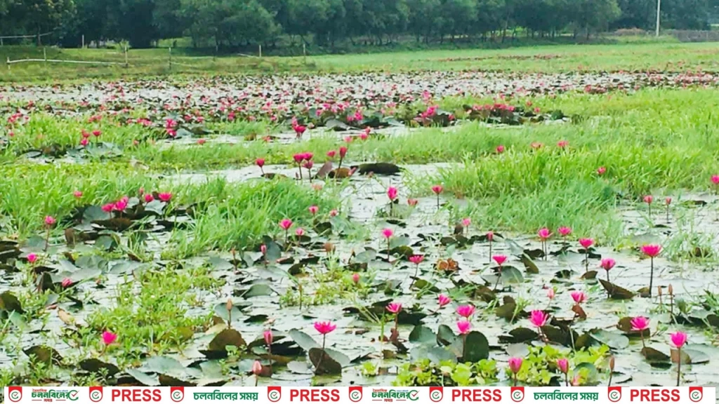 ষড় ঋতুর বাংলাদেশে এখন বইছে শরৎকাল। যদিও শরৎকাল তারপরও বর্ষার স্নিগ্ধতার রেশ এখনো রয়েছে প্রকৃতিতে-খালে-বিলের থৈ থৈ জলের ফুটে থাকা শাপলা ফুলে। শরতের সকালে শুভ্র নীল আকাশে সবে মাত্র উঁকি দিচ্ছে কুসুম সূর্য। সেই সূর্য শাপলার সবুজ পাতা আর লাল পাপড়িতে জমে থাকা শিশিরে ধরা দিয়েছে চিকিমিকি মুক্তা হয়ে। সেই সৌন্দর্য উপভোগ করতে ব্রাহ্মণবাড়িয়ার বিজয়নগর উপজেলার বিষ্ণুপুর ইউনিয়নের ছতুরপুর গ্রামের শেখ বাড়ির টোডা বিলের লাল শাপলা দেখতে প্রতিদিনই ভিড় জমাচ্ছেন শত শত দর্শনার্থী।