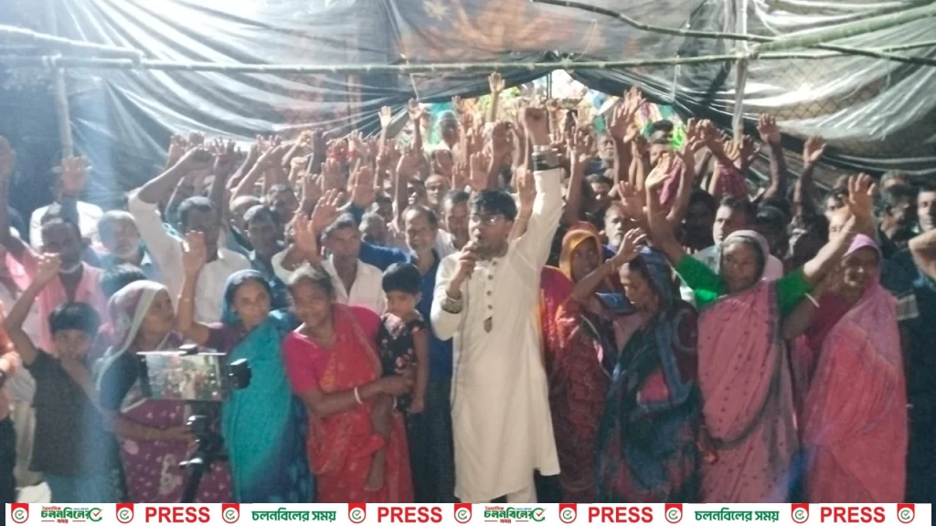 অনুষ্ঠানে হিন্দু সম্প্রদায়ের চার শতাধিক নারী-পুরুষ উপস্থিত ছিলেন। এ সময় তারা স্লোগান দেন ‘হিন্দু-মুসলমান ভাই ভাই, ধানের শীষে ভোট চাই।