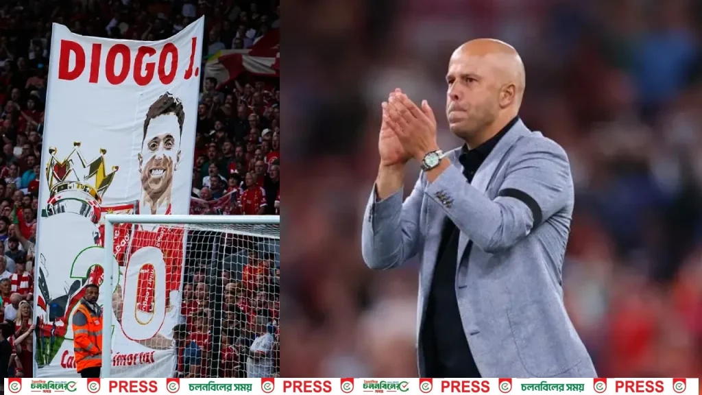 ম্যাচের শুরুতে গ্যালারিতে বিশাল মোজাইক, ২০ মিনিটের করতালি— পুরো অ্যানফিল্ড এক সঙ্গে শ্রদ্ধা জানায় জোটাকে। কোচ স্লট জানিয়েছেন, এই মৌসুমজুড়ে প্রতিটি মাঠে তার স্মৃতি বয়ে নিয়ে খেলতে চান তারা।