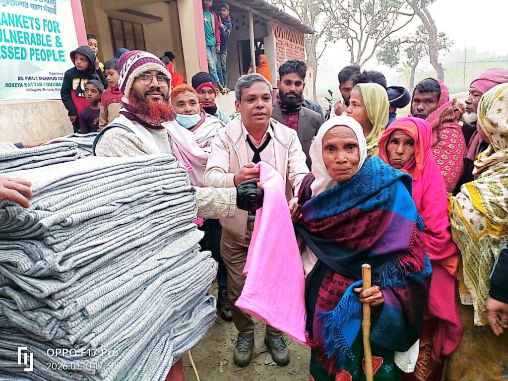 তীব্র শীতের হিমেল হাওয়ায় যখন দরিদ্র ও অসহায় মানুষের জীবন হয়ে ওঠে আরও দুর্বিষহ, ঠিক সেই সময় মানবিকতার উজ্জ্বল দৃষ্টান্ত স্থাপন করলো রোকেয়া-ছাত্তার ফাউন্ডেশন। শীতার্ত মানুষের পাশে দাঁড়িয়ে বগুড়ার শিবগঞ্জ উপজেলার সৈয়দপুর ও দেউলী ইউনিয়নে ৩০০’র বেশি অসহায় মানুষের মাঝে কম্বল বিতরণ করেছে সংগঠনটি। শনিবার (১০ জানুয়ারি ২০২৬) বিকাল ৪টায় পৃথক দুইটি স্থানে আয়োজিত এই শীতবস্ত্র বিতরণ কর্মসূচিতে শীতার্ত মানুষদের হাতে তুলে দেওয়া হয় উষ্ণ কম্বল। কনকনে শীতে কম্বল পেয়ে উপকারভোগীদের মুখে ফুটে ওঠে স্বস্তি, কৃতজ্ঞতা আর মানবিক ভালোবাসার উষ্ণ হাসি।