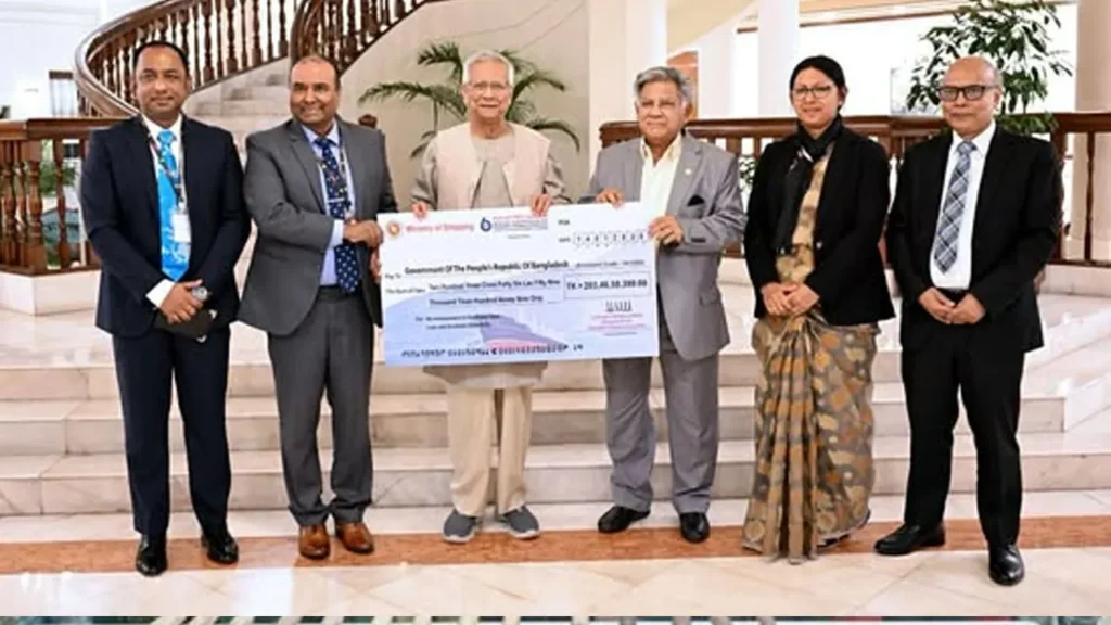 রাষ্ট্রীয় অতিথি ভবন যমুনায় প্রধান উপদেষ্টার কাছে চেক হস্তান্তর করেন নৌপরিবহন উপদেষ্টা এম সাখাওয়াত হোসেন ও বিএসসি ব্যবস্থাপনা পরিচালক কমডোর মাহমুদুল মালেক এই চেক হস্তান্তর করেন।