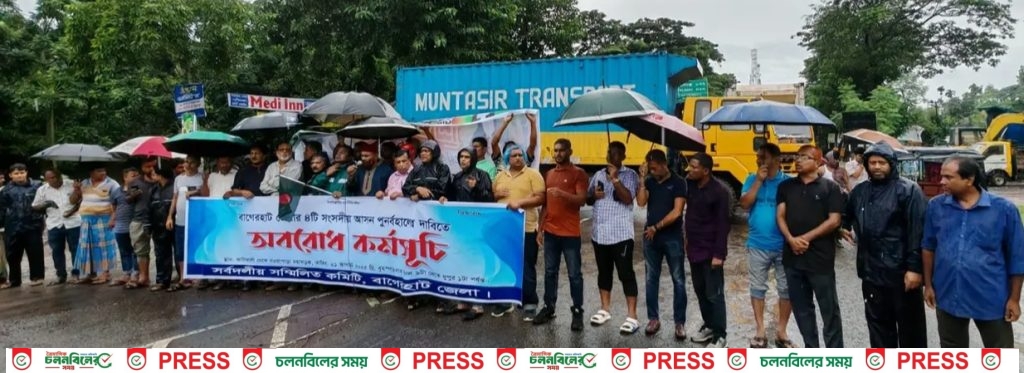 বাগেরহাটে চারটি সংসদীয় আসন বহাল রাখার দাবিতে বৃষ্টি উপেক্ষা করে খুলনা-মোংলা-মাওয়া মহাসড়কের নওয়াপাড়া ও কাটাখালী মোড়ে সড়ক অবরোধ করেছেন স্থানীয়রা।