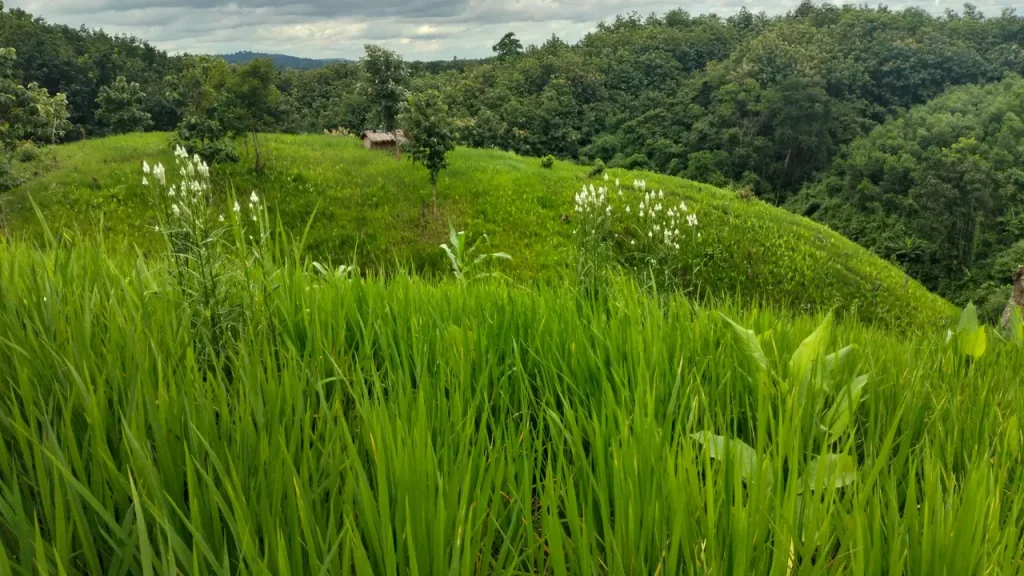 টিলার চূড়ায় উঠেই হাতের বাঁপাশে মাটিরাঙ্গা ধলীয়া মৌজা নামক স্থানে দেখা মিলবে ধান, ভুট্টা, কুমড়া বিভিন্ন প্রজাতির সবজিসহ দৃষ্টিনন্দন একটি জুম ক্ষেত। ক্ষেতের মাঝামাঝি জায়গায় ছন ও বাঁশ দিয়ে তৈরি দুটি ঝুপড়ি ঘর দাঁড়িয়ে আছে সাদামাটাভাবে। তবে এ সরল নির্মাণশৈলী যেন ক্লান্ত পথিক বা জুমিয়াদের জন্য স্বস্তির আশ্রয় যে কেউ সেখানে কয়েক মিনিট বসলে শরীরের ক্লান্তি দূর হয়ে যাবে নিশ্চিতভাবেই।