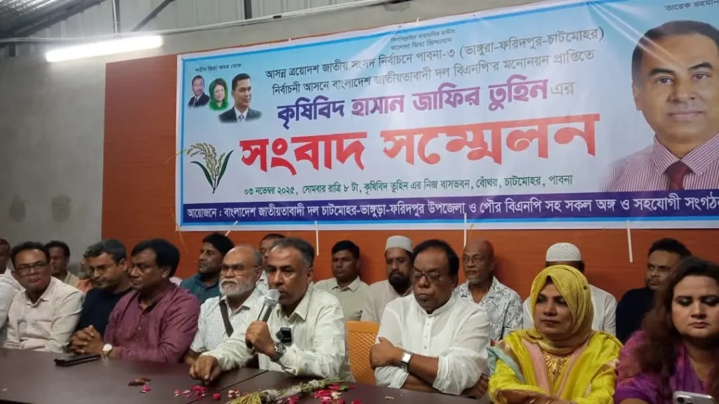 আসন্ন জাতীয় সংসদ নির্বাচনে পাবনা-৩ (চাটমোহর-ভাঙ্গুড়া-ফরিদপুর) আসনে বাংলাদেশ জাতীয়তাবাদী দল (বিএনপি) থেকে দলীয় মনোনয়নপ্রাপ্ত প্রার্থী ও জাতীয়তাবাদী কৃষকদলের কেন্দ্রীয় সভাপতি কৃষিবিদ হাসান জাফির তুহিন বলেছেন, নির্বাচিত হলে সর্বত্র সুশাসন প্রতিষ্ঠায় ভূমিকা রাখতে সচেষ্ট থাকবো।