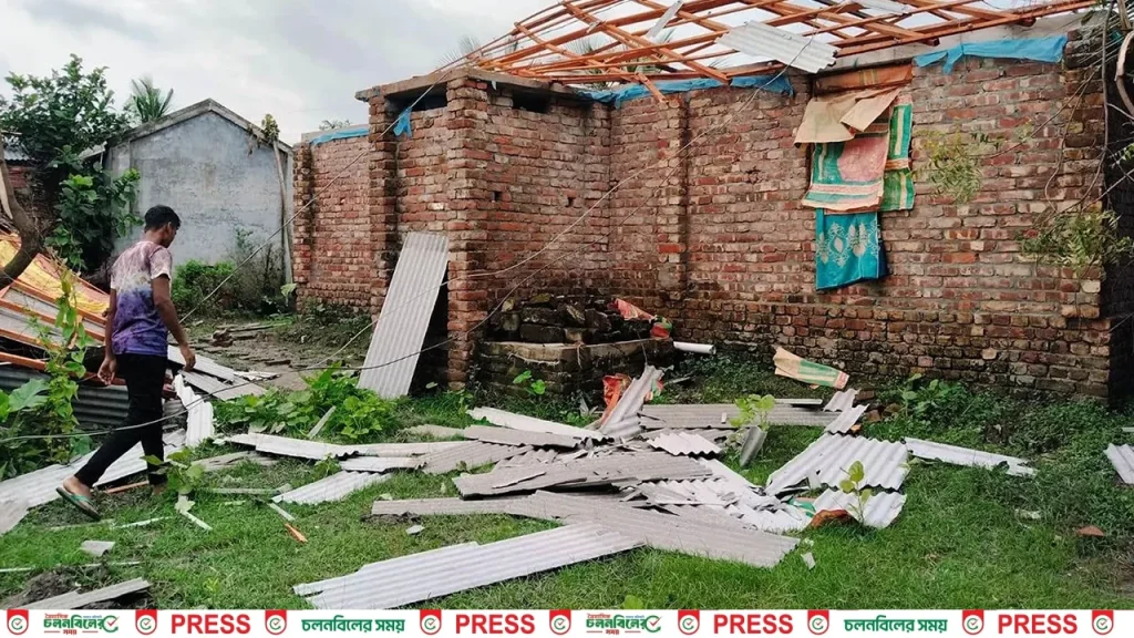 প্রত্যক্ষদর্শীরা জানান, হঠাৎ শুরু হওয়া প্রবল বাতাস মাত্র কয়েক সেকেন্ডের মধ্যেই পুরা ঘরটিকে উল্টে-পাল্টে দেয়।