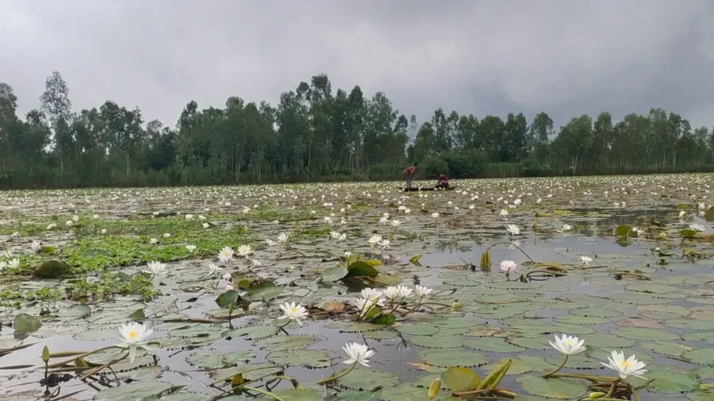 দিনাজপুর জেলার বিরামপুর উপজেলার খিয়ারমামুদপুর গ্রামে রয়েছে এক অপরূপ জলাভূমি, যেটি এখন পরিচিত হয়ে উঠেছে সাদা শাপলার বিল নামে। বর্ষাকালে বিস্তীর্ণ এ বিলে যখন নৌকা ভেসে চলে, তখন মনে হয় যেন কেউ ফুলের বাগানের ভেতর দিয়ে ভ্রমণ করছে। শান্ত জলের বুকে অসংখ্য সাদা শাপলা মাথা উঁচু করে দাঁড়িয়ে থাকে। চোখ যতদূর যায় শুধু শাপলার সারি, আর সেই সৌন্দর্য উপভোগ করতে প্রতিদিন শত শত মানুষ এখানে ছুটে আসেন।